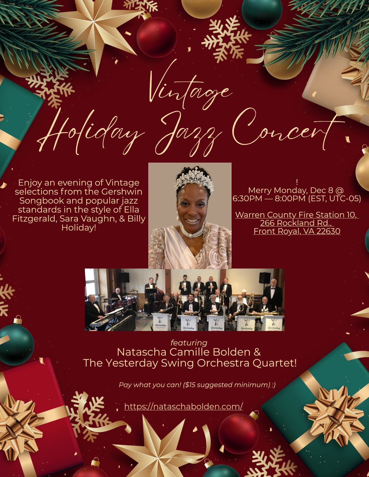 The Yesterday Swing Orchestra Jazz Quartet, is pleased to be backing up local talent, Natascha Bolden for this unique Holiday Concert Celebration!